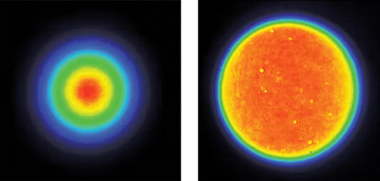 AdlOptica πShaper Flat-Top-Laserstrahlkonverter sind optische Systeme, die durch Brechung die kollimierten gaußschen Eingangsstrahlen in kollimierte Flat-Top-Strahlen mit gleichmäßiger Verteilung der Lichtstärke und ebener Phasenfront umwandeln. Aufgrund des optischen Designs ist die gleichmäßige Intensitätsverteilung des konvertierten Strahls über große Distanzen stabil, und damit ist dieses Konzept ideal für die Holographie, Mikroskopie und Systemintegration. Ohne interne Fokussierung sind diese Systeme auch die perfekte Lösung für Anwendungen wie Mikrobearbeitung von Werkstoffen, Schweißen und Gravieren, bei denen hohe Laserleistungen benötigt werden. Diese AdlOptica πShaper Flat-Top-Laserstrahlkonverter werden in verschiedenen Designwellenlängen für gängige Nd:YAG-, Faserlaser-, CO2- und andere gängige Laserquellen angeboten. Jeder Laserstrahlkonverter ist für einen bestimmten Wellenlängenbereich geeignet, sodass er mit einem durchstimmbaren Laser verwendet werden kann. Achromatische Versionen können mit verschiedenen Laserquellen verwendet werden können.