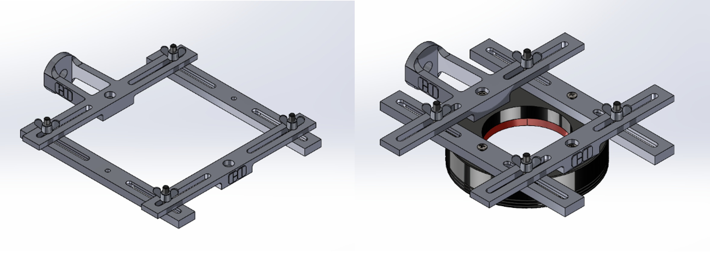Several different mounting configurations can be created with the simple four-rail bracket system, including mounts for ring lights, bar lights, and more. A simple mount for 8mm diameter spot lights was also designed to use for on or off-axis illumination. The system is easily interchangeable for different mounting screw sizes on the lights, as the throughput hole size can be adjusted based on the size of the mounting screws with the light. The rails are easy to adjust in CAD and can be printed with most standard 3D printers. When used with the Articulating Arm Systems, the mounting system becomes compatible with an 80/20 frame system or a ¼-20” size thread optical air table, allowing for it to be mounted in multiple locations within a standard optical lab. Below is a summary of example configurations and links to download the STL files: