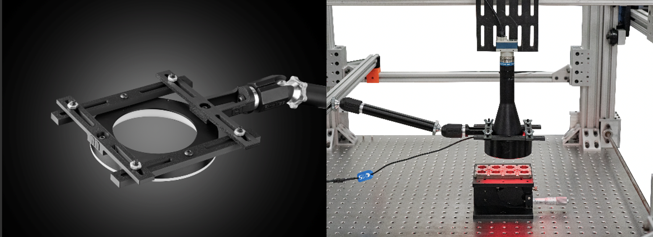 The illumination mounts designed by Edmund Optics® combine versatility, stability, and ease of use to support a wide range of machine vision lighting setups. With adjustable 3D printed brackets, Articulating Arm Systems offered by Edmund Optics®, and compatibility with 80/20 frames or optical tables, these mounts simplify integration for high-performance imaging applications. This flexibility also makes it easy to integrate into existing setups without the need for custom adapters. Whether it’s used for just benchtop prototyping or full-scale production environments, the system supports quick re-positioning and secure mounting, vastly reducing setup time.