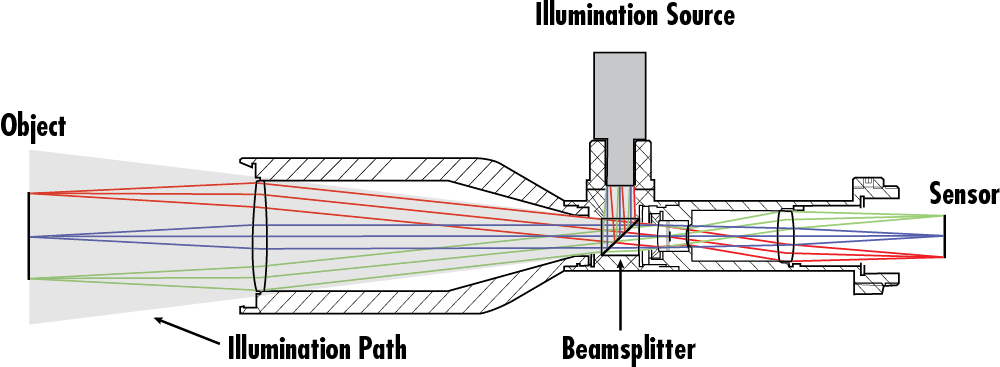 Die In-Line-Beleuchtung ist in Kombination mit einem telezentrischen Bildverarbeitungsobjektiv eine leistungsstarke Technik für hochpräzise Bildverarbeitungsanwendungen, bei denen kontrastarme Oberflächenmerkmale erkannt oder Durchgangsbohrungen geprüft werden müssen. Diese koaxiale Beleuchtungsmethode lenkt das Licht mithilfe eines Strahlteilers entlang der optischen Achse des Bildverarbeitungsobjektivs und ermöglicht eine gleichmäßige, schattenfreie Beleuchtung, die Oberflächendefekte, geätzte Markierungen oder transparente Merkmale mit minimalem Reflexionsgrad hervorhebt (Abbildung 1). Telezentrische Objektive verbessern diesen Aufbau weiter, indem sie eine gleichmäßige Vergrößerung über das gesamte Bildfeld gewährleisten und perspektivische Fehler ausschließen, was für genaue Dimensionsmessungen von entscheidender Bedeutung ist. In diesem Anwendungshinweis werden Beispielbilder von Objekten mit unterschiedlichen Oberflächen bei In-Line-Beleuchtung betrachtet. Die folgenden Bilder wurden mit dem telezentrischen 0,69X-CobaltTL-Objektiv unter Verwendung eines diffusen, weißen Punktstrahlers aufgenommen, um Hot-Spots zu minimieren.
