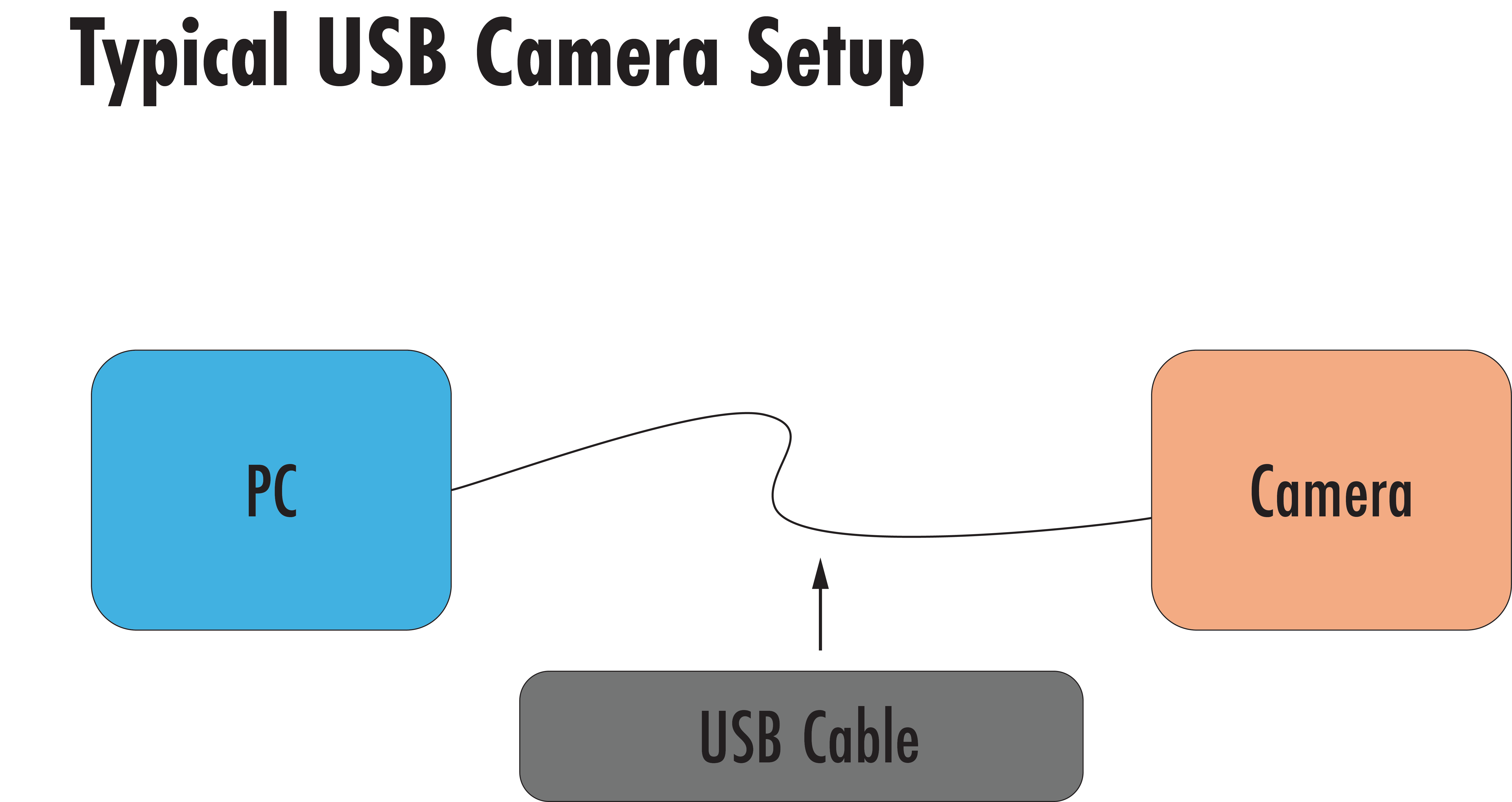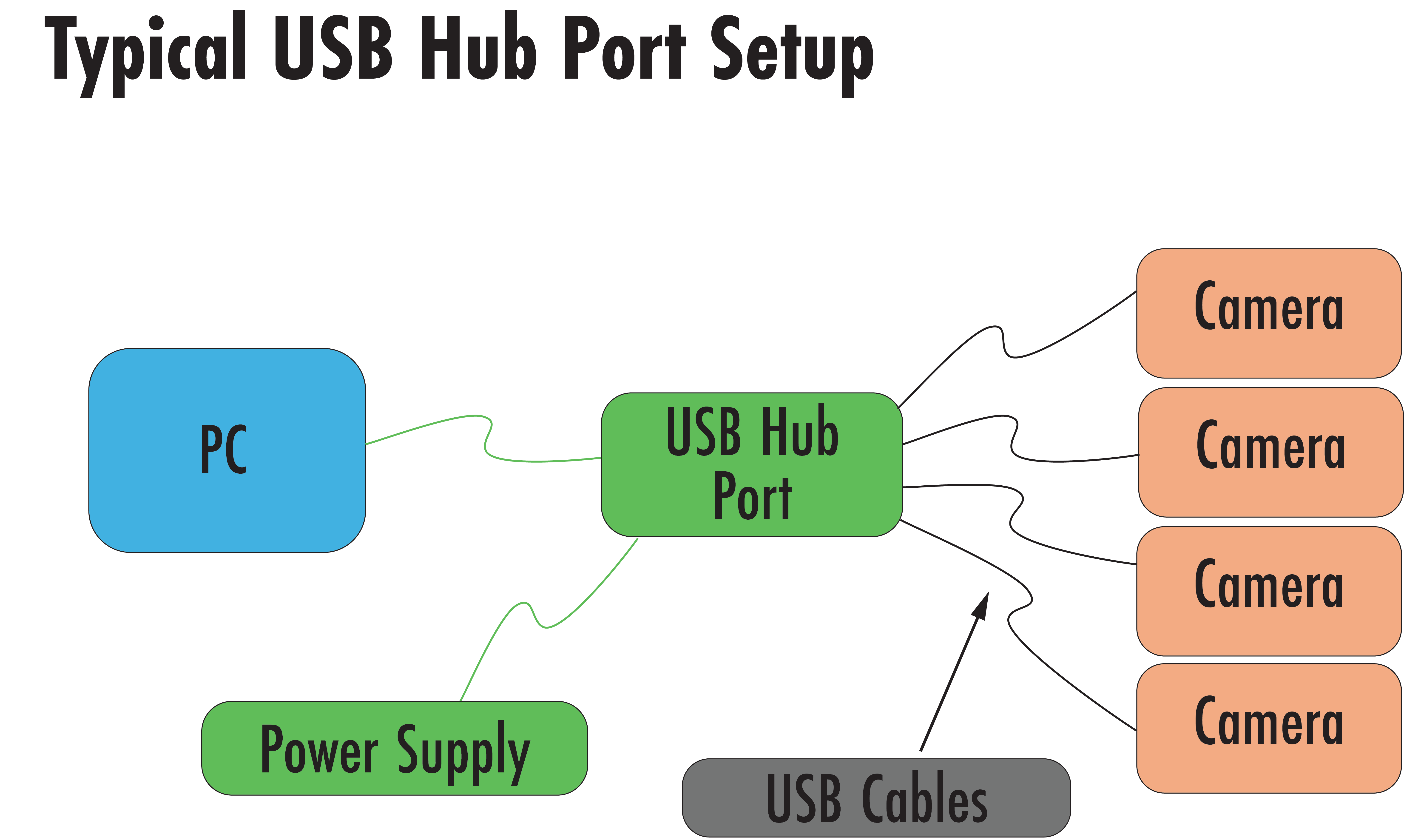 Der USB-Hub-AnschlussNeben der begrenzten Kabellänge von nur wenigen Metern ist eine weitere Einschränkung bei USB die Bandbreite. Das bedeutet, dass mehrere Kameras zwar über einen USB Hub mit mehreren Ports an einen PC angeschlossen werden können, sich aber alle die Bandbreite des PCs teilen würden. Abbildung 3 unten zeigt eine Grundkonfiguration, bei der die grün markierten Elemente in der Regel zum Hub-Port gehören.
