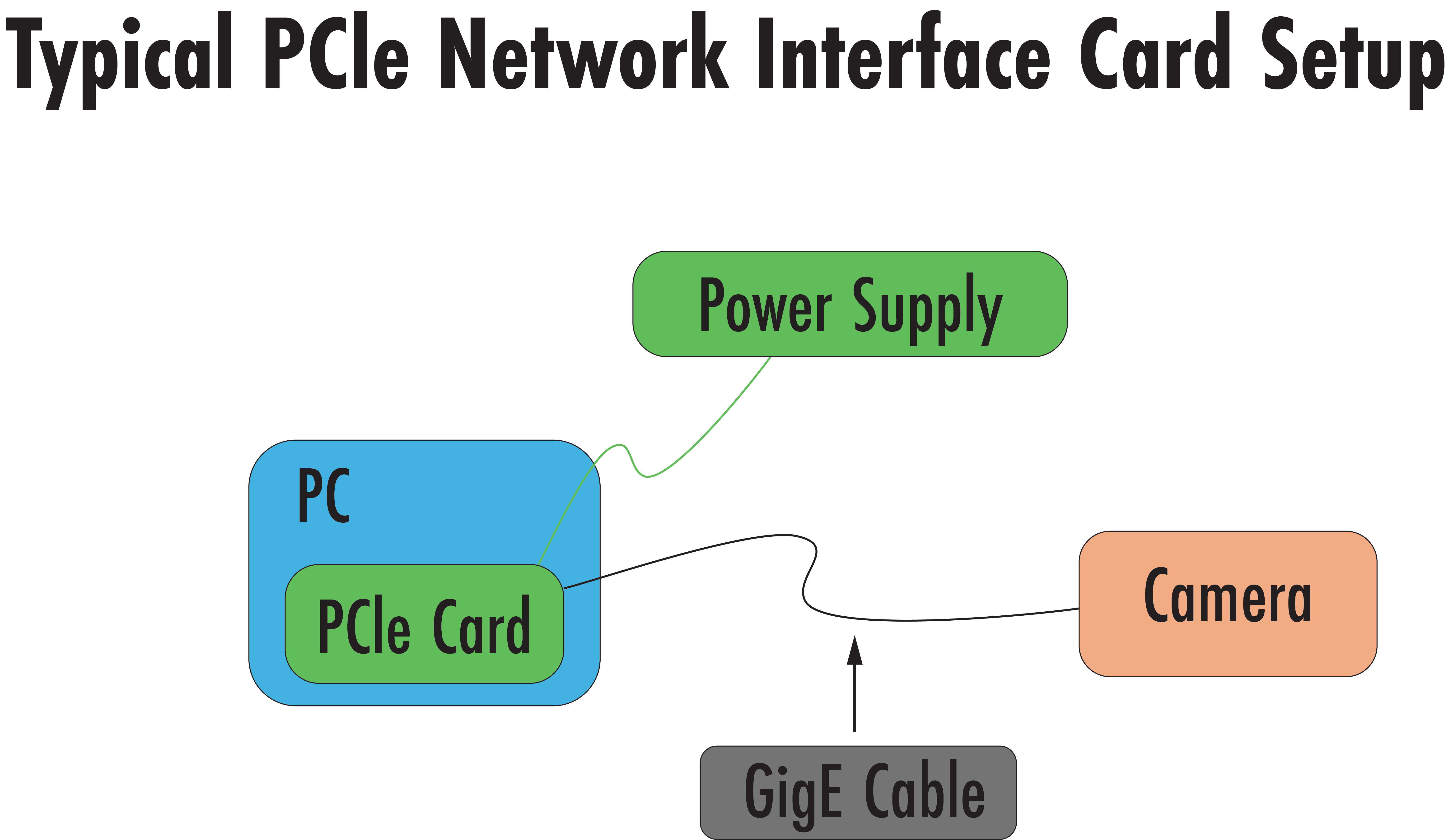 Die Netzwerkschnittstellenkarte (Network Interface Card, NIC) wird an den Peripheral Component Interconnect Express (PCIe)-Steckplatz eines PCs angeschlossen, um die Abbildungsleistung des PCs zu verbessern. Ähnlich wie beim Netzwerk-Verteiler ist in der Regel ein separates Netzteil erforderlich, sofern es nicht bereits im Lieferumfang enthalten ist. Ethernet-Kabel verbinden mehrere GigE-Kameras mit der Karte und werden für die Stromversorgung der Kamera und für die Datenübertragung verwendet. Es können bis zu 4 Kameras gleichzeitig an eine PCIe-Karte angeschlossen werden. Abbildung 6 zeigt einen typischen Aufbau einer Netzwerkschnittstellenkarte. Für die Installation einer Karte muss der PC geöffnet werden, um den PCIe-Steckplatz zu finden. Daher ist es wichtig, vor dem Kauf zu prüfen, ob der PC über ausreichend Platz verfügt.