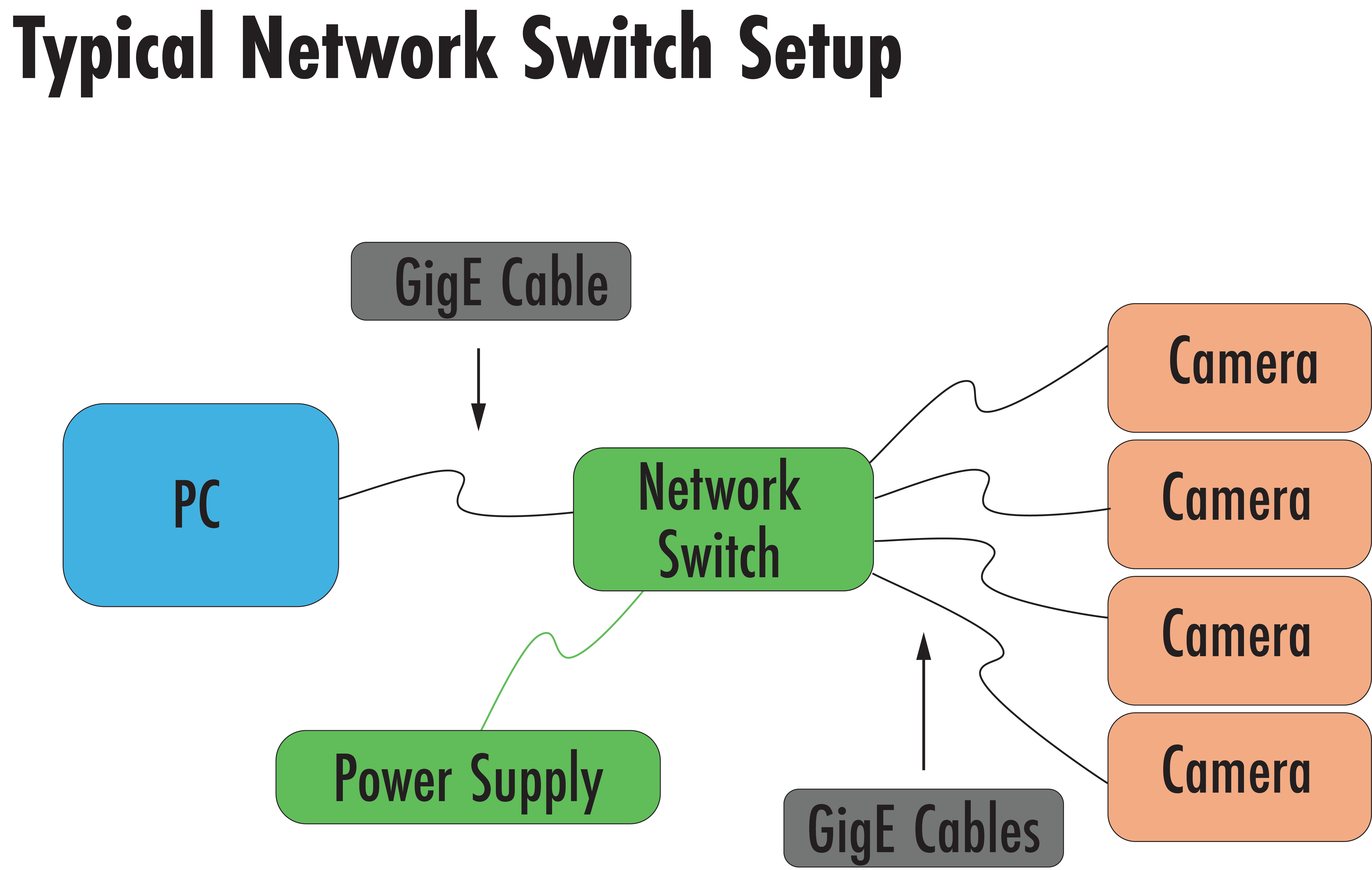 Wenn Sie mehrere GigE-Kameras oder sogar andere Ethernet-Geräte betreiben, können Sie mit dem PoE-Netzwerk-Verteiler mehrere Geräte an das Netzwerk eines lokalen Computers anschließen. Dieses Setup maximiert die verfügbare Bandbreite pro Kamera in Multi-Kamera-Konfigurationen. Jede Kamera wird über ein ausgewähltes Ethernet-Kabel, das für die Stromversorgung und die Datenübertragung verwendet wird, an den Verteiler angeschlossen. Ein Ethernet-Kabel führt außerdem vom Computer zum Verteiler. Wie der PoE-Injektor benötigt auch der Verteiler eine eigene externe Stromversorgung, sofern diese nicht bereits enthalten ist. Abbildung 5 unten zeigt einen typischen Aufbau. Mit dem PoE-Verteiler lassen sich zwar gleichzeitig mehrerer Kameras anschließen, bedenken Sie jedoch, dass eine begrenzte Netzwerkbandbreite die Bildrate beeinträchtigen kann, wenn viele Kameras mit hoher Auflösung oder hoher Bildrate angeschlossen sind.