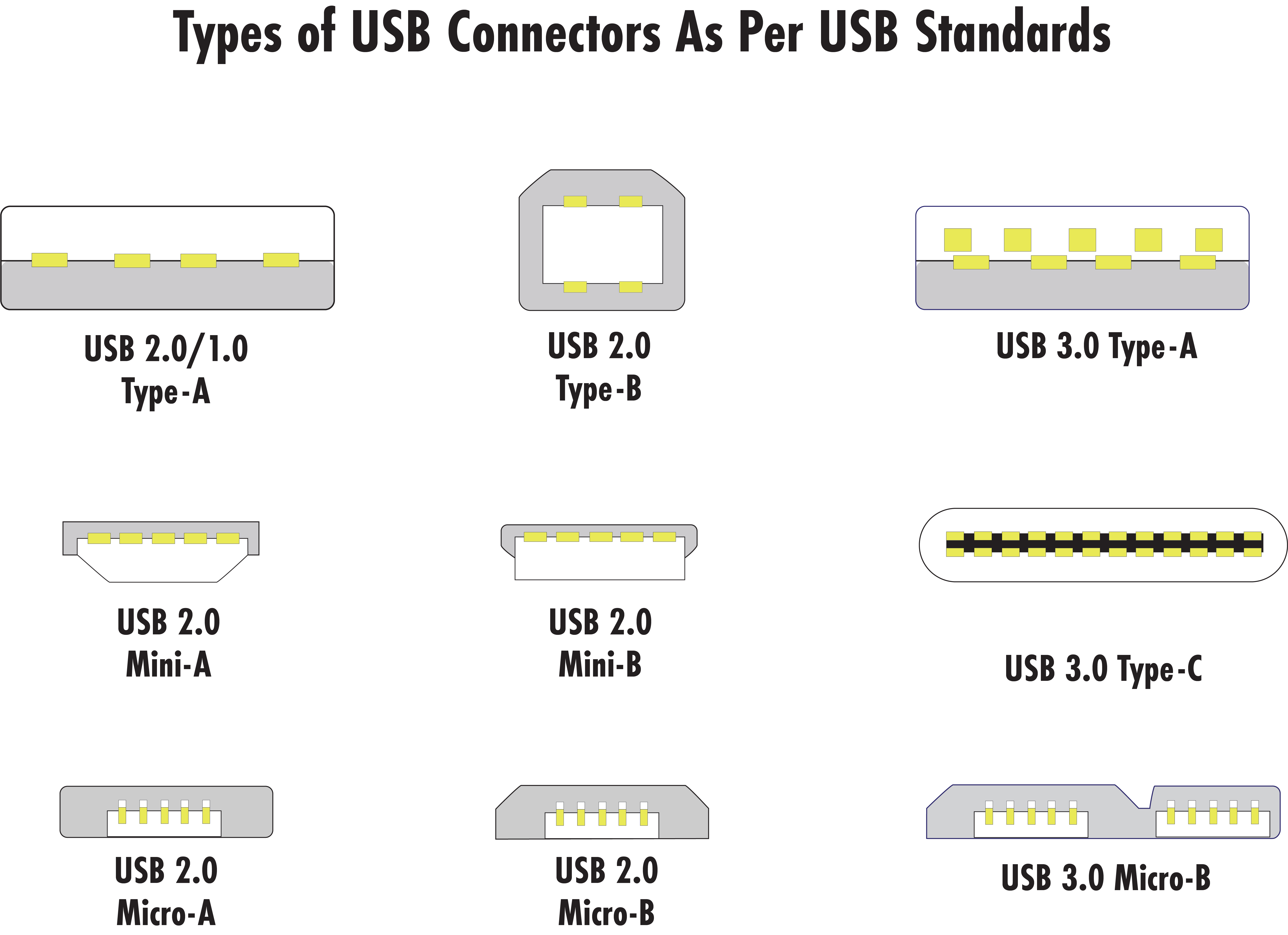 Die meisten Computer sind mit USB-Typ-A-Anschlüssen ausgestattet, die als hostseitiger Anschluss dienen. Welches Kabel benötigt wird, hängt vom Typ des USB-Anschlusses an der Kamera ab, der in der Regel in den technischen Daten der Kamera aufgeführt ist. Einen kurzen Überblick über die gebräuchlichen USB-Anschlüsse gibt Abbildung 2.