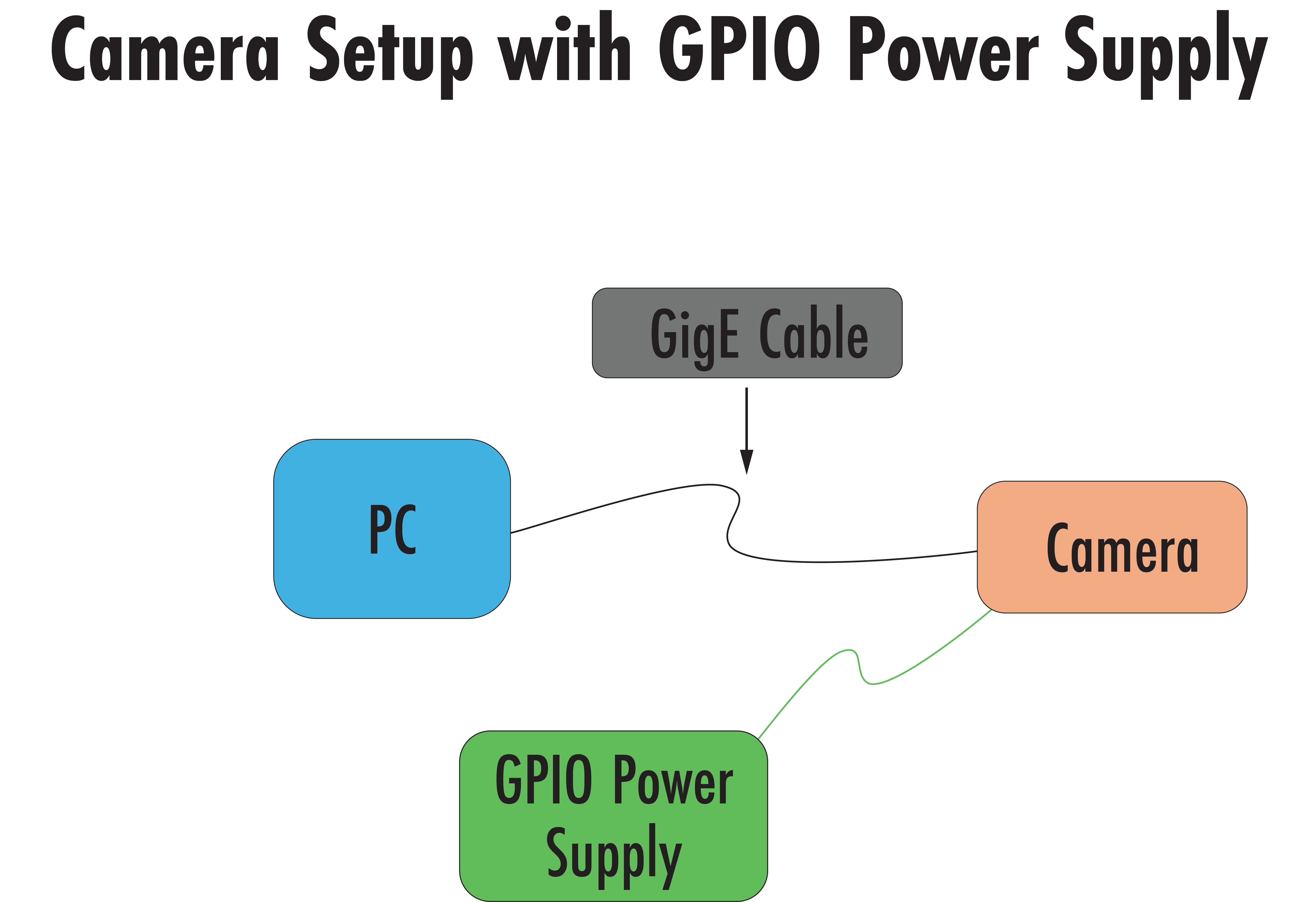 GPIOWährend GigE-Kameras häufig über Power-over-Ethernet (PoE) mit Strom versorgt werden, bieten sie eine weitere Option zur Stromversorgung über den GPIO-Anschluss (General-Purpose Input/Output), der manchmal auch als I/O-Anschluss bezeichnet wird. Bei Kameras ohne PoE-Funktionalität dient der GPIO-Port als primärer Eingang für die Stomversorgung. Bei dieser Konfiguration erfolgt die Stromversorgung über ein externes Netzteil und nicht über das Ethernet-Kabel. Dies ist ideal für Systeme, bei denen der Platz begrenzt ist und eine effiziente Stromnutzung mit minimaler Wärmeentwicklung und geringen Kabelübertragungsverlusten unerlässlich ist. Die Einrichtung würde immer noch das Ethernet-Kabel für die Datenübertragung erfordern, es wird jedoch kein PoE-Gerät, wie z. B. ein Port-Injektor, benötigt (siehe Abbildung 7 unten). Wenn Sie externe Geräte wie Trigger-Hardware verwenden, werden diese in der Regel ebenfalls über den GPIO-Port angeschlossen. Wenn eine solche Hardware verwendet wird, steht der GPIO-Anschluss möglicherweise nicht mehr für die Stromversorgung der Kamera zur Verfügung. In diesem Fall muss die Stromzufuhr über einen PoE-Injektor erfolgen, oder es sollte ein Kabel mit offenen Enden in Betracht gezogen werden, um Strom wie auch das Triggersignal über separate Enden bereitzustellen. Die Hardware-Optionen sind auf der Registerkarte „Spezifikationen“ für jede Kamera aufgeführt, sofern verfügbar.