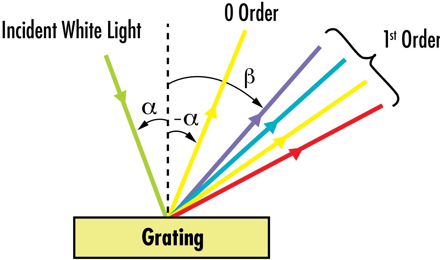 m ist ein ganzzahliger Wert, der die Beugungsordnung (oder spektrale Ordnung) beschreibt, λ ist die Wellenlänge des Lichts, d ist der Abstand zwischen den Rillen des Gitters, α ist der Einfallswinkel des Lichts und β ist der Beugungswinkel des Lichts, das das Gitter verlässt. Konstruktive Interferenz verschiedener Beugungswellenfronten tritt bei ganzzahligen Vielfachen der Wellenlänge auf, weshalb „m“ in Gleichung 1 erscheint. m definiert die Beugungsordnungen, wobei Beugungswinkel m = 1 als Beugung 1. Ordnung, Winkel mit m = 2 als Beugung 2. Ordnung und so weiter angesehen werden (Abbildung 2). Wenn m = 0 ist, wird das Licht entweder direkt vom Gitter reflektiert oder durch das Gitter transmittiert, je nachdem, ob es sich um ein Reflexions- oder Transmissionsgitter handelt, und dieses Licht wird als Beugung „0-ter Ordnung“ betrachtet. Im Gegensatz zu Dispersionsprismen liegen die unteren Wellenlängen immer näher am direkt reflektierten oder durchgelassenen Licht, in diesem Fall der 0-ten Ordnung. Bestimmte Ordnungen können sich überschneiden. Alle Winkel werden vom senkrechten Lichteinfall zum Gitter gemessen.