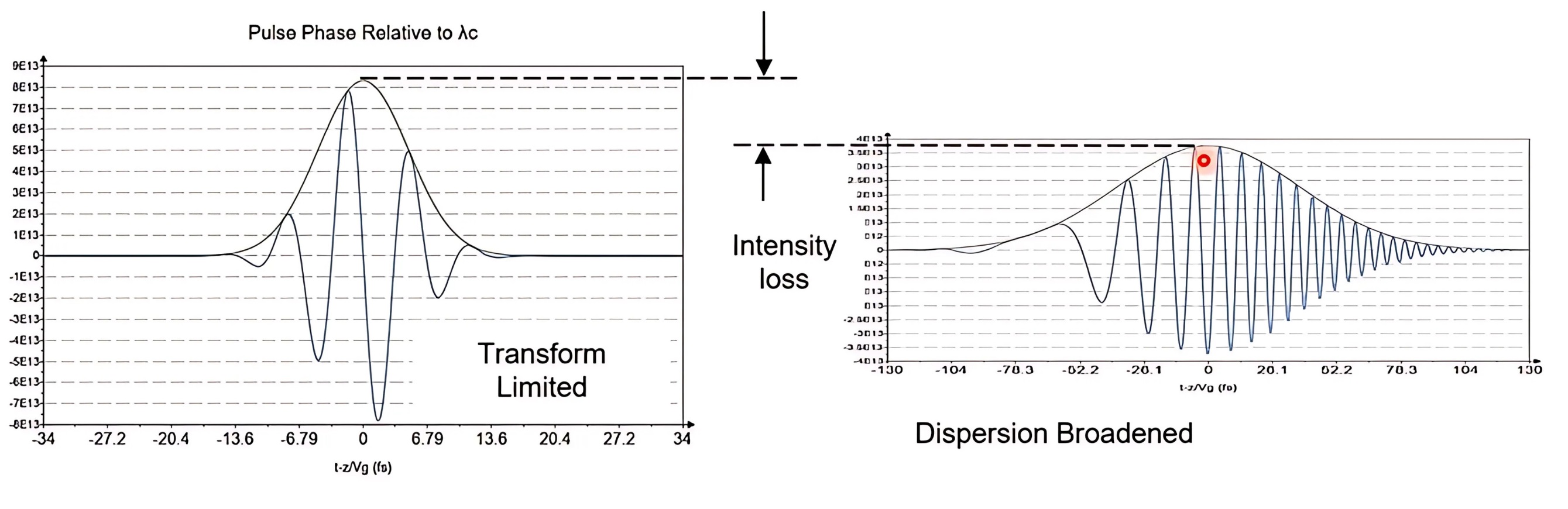 Group delay dispersion (GDD) refers to the broadening of the pulse envelope over time as it propagates through a dispersive medium. At the point of generation, the pulse is extremely short due to the constructive and destructive interference of multiple frequency components. However, as it passes through a material with a wavelength-dependent refractive index, each frequency experiences a slightly different delay. This causes the components to slip out of phase, spreading the pulse in time and reducing its peak intensity (Figure 7).