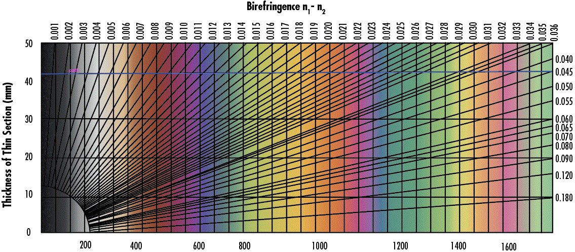 Der Analysator lässt nur dann Licht durch, wenn eine durch die Probe bewirkte Phasenverschiebung auftritt, und blockiert weiterhin das ganze unbeeinflusste Licht von der Quelle, das zuerst vom Polarisator polarisiert wurde. Wenn die Doppelbrechung der Probe bekannt ist, kann die Dicke der Probe bestimmt werden. Wenn die Dicke der Probe bekannt ist, kann daraus die Doppelbrechung der Probe abgeleitet werden. Ein praktisches Diagramm, das für diesen Zweck verwendet wird, ist die Interferenzfarbtafel von Michel-Lévy in Abbildung 14.