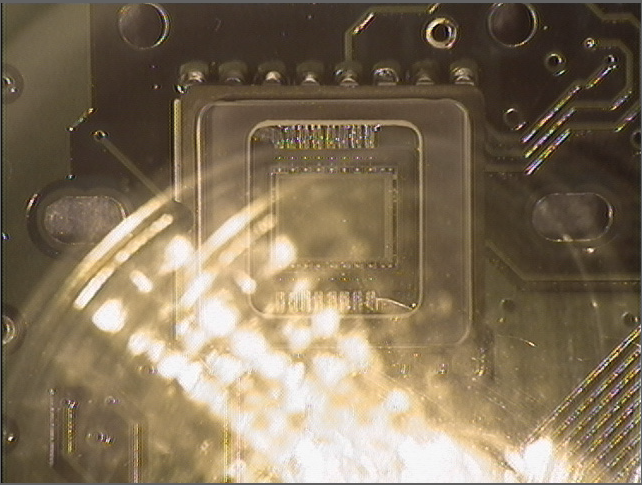 In Abbildung 5 wurde ein linearer Polarisator vor dem Objektiv eines Bildverarbeitungssystems angebracht, um verwirrende Glanzeffekte zu beseitigen, damit ein elektronischer Chip deutlich sichtbar ist. Das linke Bild (ohne Polarisator) veranschaulicht die Streuung von willkürlich polarisiertem Licht durch die vielen Glasoberflächen zwischen dem Objekt und dem Kamerasensor. Ein Großteil des Chips ist aufgrund der Fresnel-Reflexion des unpolarisierten Lichts nicht erkennbar. Das Bild auf der rechten Seite (mit Polarisator) zeigt den Chip ohne verwirrende Glanzeffekte, die die Objektdetails verdecken, sodass der Chip ohne Behinderung angezeigt, analysiert und vermessen werden kann.