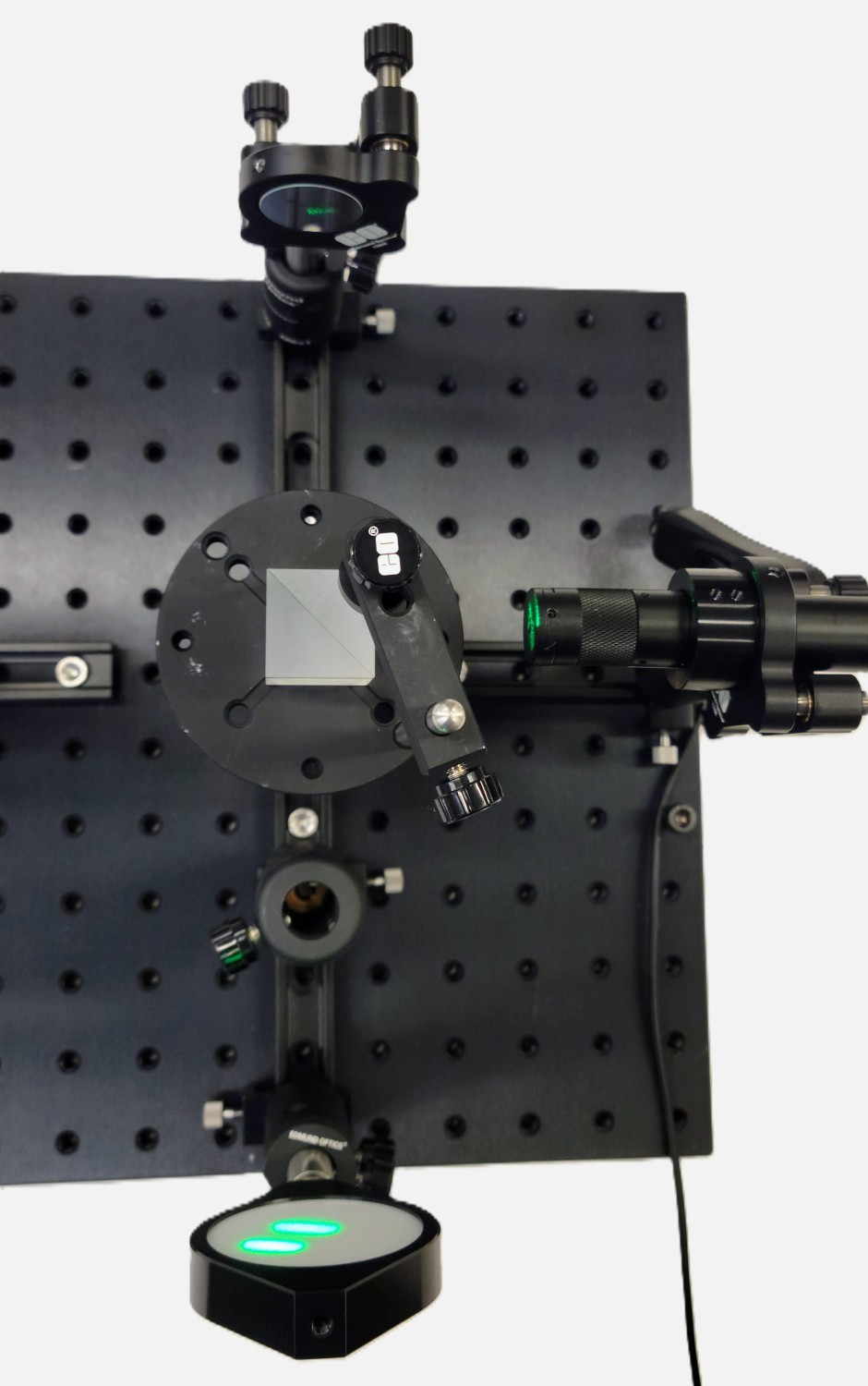 Nun müssen Sie die Halterung für den Strahlteilerwürfel zusammenbauen. Die Prismenhalter mit der Produktnummer 53-030 von Edmund Optics® benötigt für die Montage an der Stange einen 1/4-20 Gewindeadapter (siehe Abbildung 9). Verwenden Sie beim Umgang mit dem TECHSPEC® Strahlteilerwürfel unbedingt Fingerlinge, um Schmutz und Fingerabdrücke zu vermeiden.