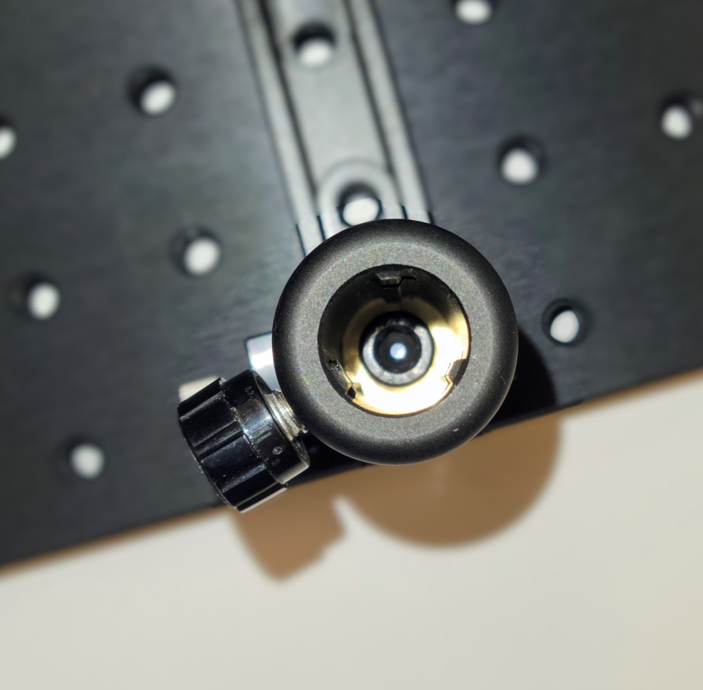 Verschieben Sie als nächstes den ersten Spiegel auf die durchgehende Schiene. Der Stangeklemmring hilft dabei, die Höhe beim Ausrichten des zweiten Spiegels konstant zu halten. Wiederholen Sie den Ausrichtungsvorgang mit dem Laser für den zweiten Spiegel (siehe Abbildung 8).