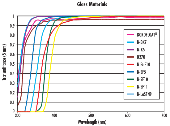 Optische Standardgläser haben eine hohe Transmission im gesamten sichtbaren Spektrum und darüber hinaus auch im nahen Infrarot- und nahen ultravioletten Bereich. Abbildung 1 zeigt einige typische Transmissionskurven. Krongläser haben eine bessere Transmission im nahen ultravioletten Bereich als Flintgläser. Flintgläser haben aufgrund ihres hohen Brechungsindex einen höheren Verlust durch Fresnelreflexion und sollten daher immer mit einer Antireflexionsbeschichtung bestellt werden.