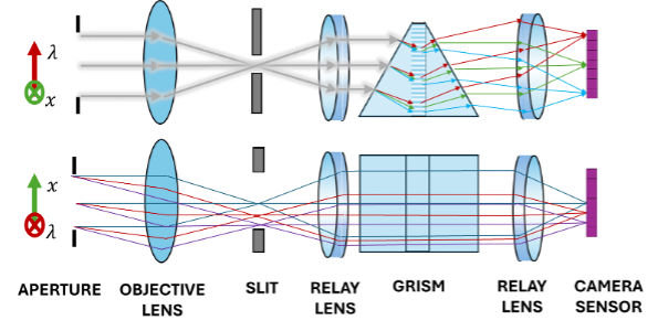 FINCH EYE employs a push-broom hyperspectral imaging architecture, as illustrated in Figure 2. In this approach, the satellite images a single stripe on the Earth’s surface and disperses light into its spectral components along the perpendicular axis of the camera sensor. The satellite scans across the Earth’s surface as it orbits, thus acquiring a hyperspectral “datacube” with two spatial axes and one spectral axis of information. Within FINCH EYE, this is implemented with a commercial objective lens that images the Earth, a slit which “selects” one stripe on the ground, and a dispersive lens – grating – lens relay that reimages light from the slit onto the camera sensor.